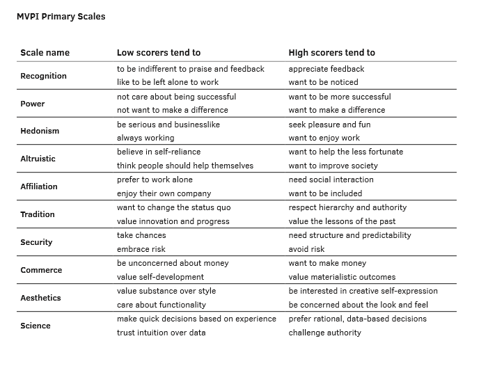 MVPI allows us to evaluate the degree of fit between an individual’s values and the rewards or environment provided by an organisation.